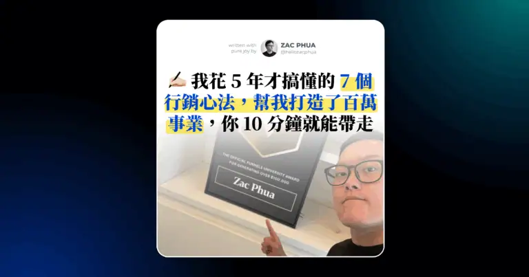 新文章 ZP 2.0 | 個人成長記錄 | 行銷經驗分享 我花 5 年才搞懂的 7 個行銷心法,幫我打造了百萬事業,你 10 分鐘就能帶走 ByZac Phua 20 10 月, 202520 10 月, 2025 過去 3 年,我幫助過超過 40 位課程講師設計銷售頁、代操過不少課程行銷專案,也諮詢了上百位客戶與學員。 再…
