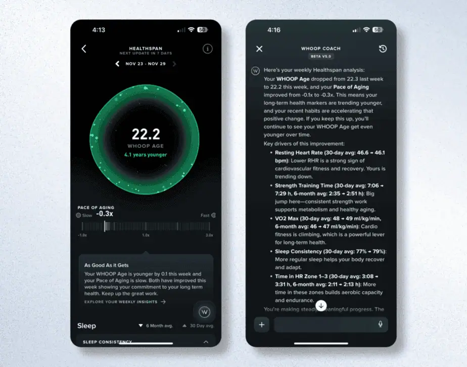 我的 Whoop(下方截圖的 app) 的報告顯示,讓我能維持「逆齡狀態」的最大關鍵因素,是我的睡眠品質。